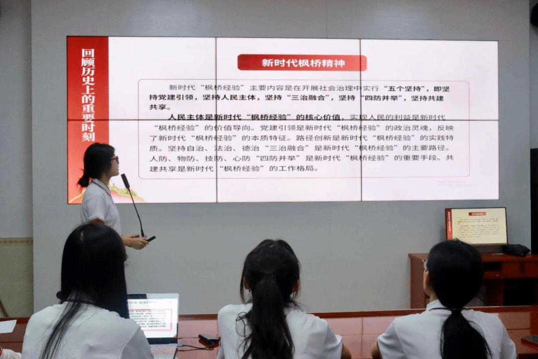 7月8日下午,实践团组织策划了大中小员工破冰互动环节,通过“乒乓球接力赛”“桃花朵朵开”“正话反做”等系列活动,拉进青髫志愿者与实践团成员之间的距离。紧接着,实践团开展枫桥社区发展沿革及治理经验学习交流会。会上,实践团成员各抒己见,讨论热烈,并合理利用多媒体设备展示学习成果,在交流互鉴中深入了解枫桥为民、利民、惠民的实践做法。