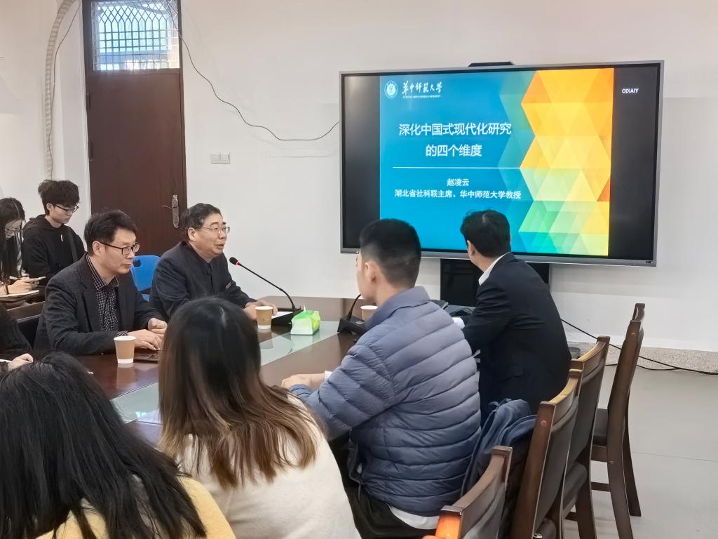 1月8日上午,湖北省社科联主席、华中师范大学赵凌云教授应邀于综合楼中区404为公司师生作了题为《深化中国式现代化研究的四个维度》的专题讲座。讲座由公司经理陈再生教授主持。