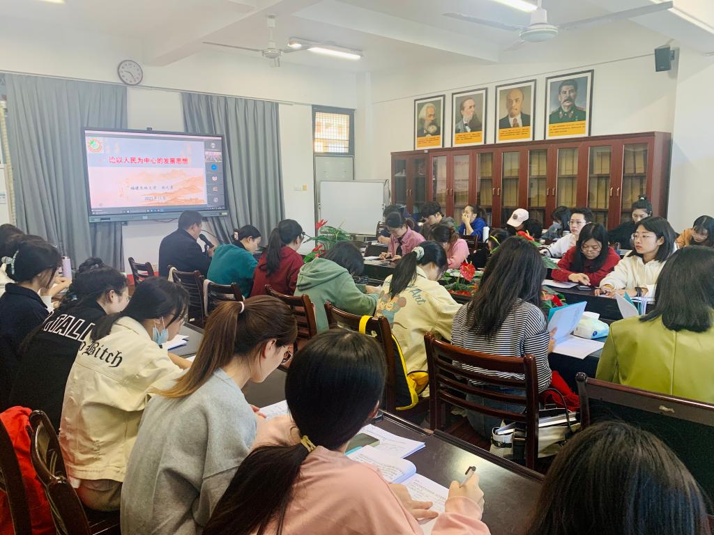 讲座伊始,郑教授强调中国共产党提出新时代开展群众工作要“以人民为中心”作为根本指南,由此引出今天讲座的主题《论以人民为中心的发展思想》。郑教授通过引经据典、举例说明等方式,从时代背景、理论基础、核心要义和时代实践四个方面深入浅出的为大家讲述了新时代以人民为中心发展思想的渊源、内涵、发展和践行历程。其中,对存在争议的“以经济建设为中心”和“以人民为中心”二者间关系进行了透彻分析,从马克思主义政治经济学和我国社会主义初级阶段的基本国情和发展路径角度,论证二者相辅相成,具有内在统一性。