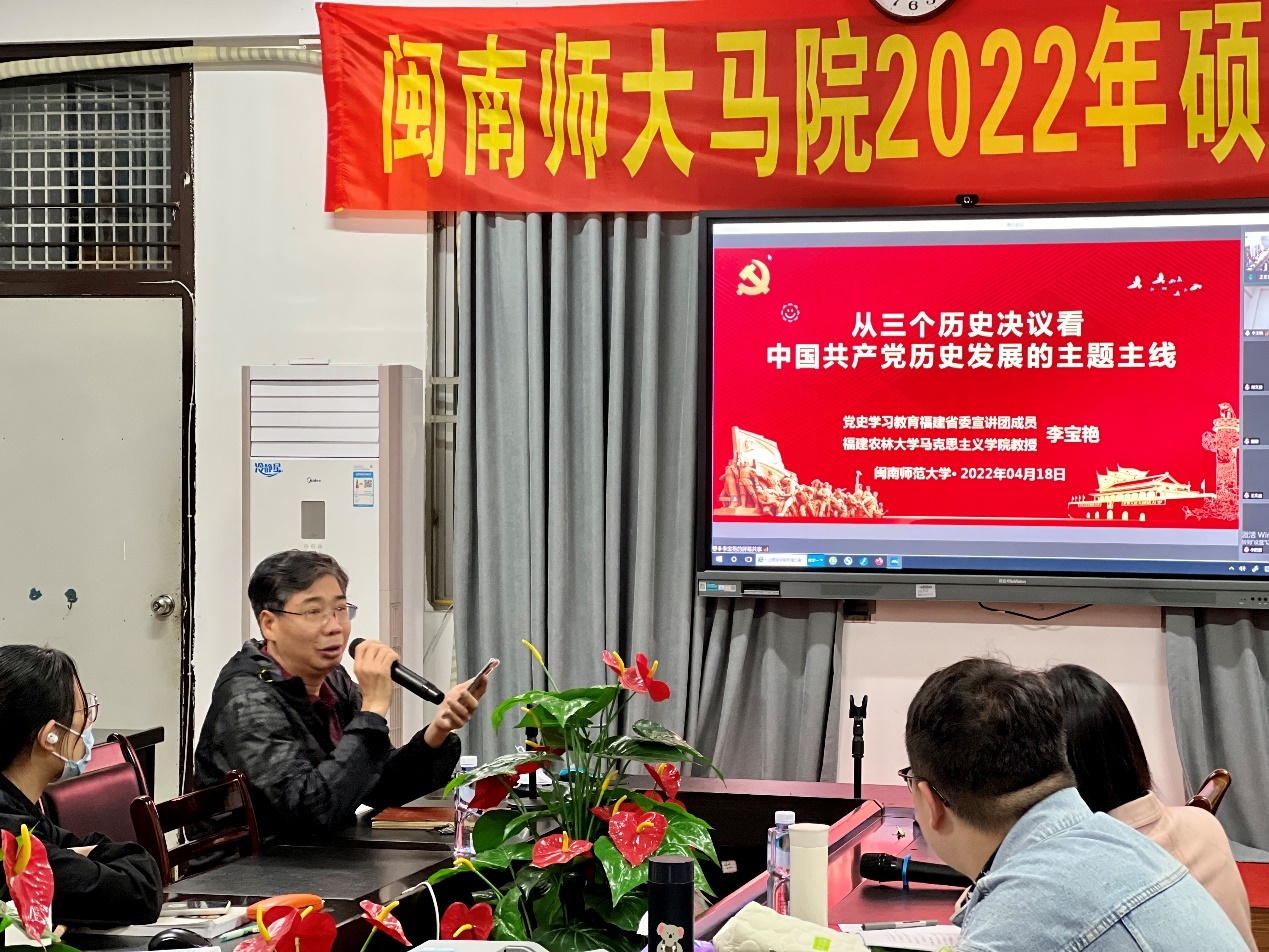 4月18日晚,福建农林大学bevictor教授、硕士生导师李宝艳教授应邀为公司硕士研究生作了《从三个历史决议看中国共产党历史发展的主题主线》专题讲座。本次讲座以线上线下结合形式举行,2021级硕士生在综合楼中区404会议室现场聆听,其他研究生通过腾讯会议在线收听,讲座由公司陈再生教授主持。
