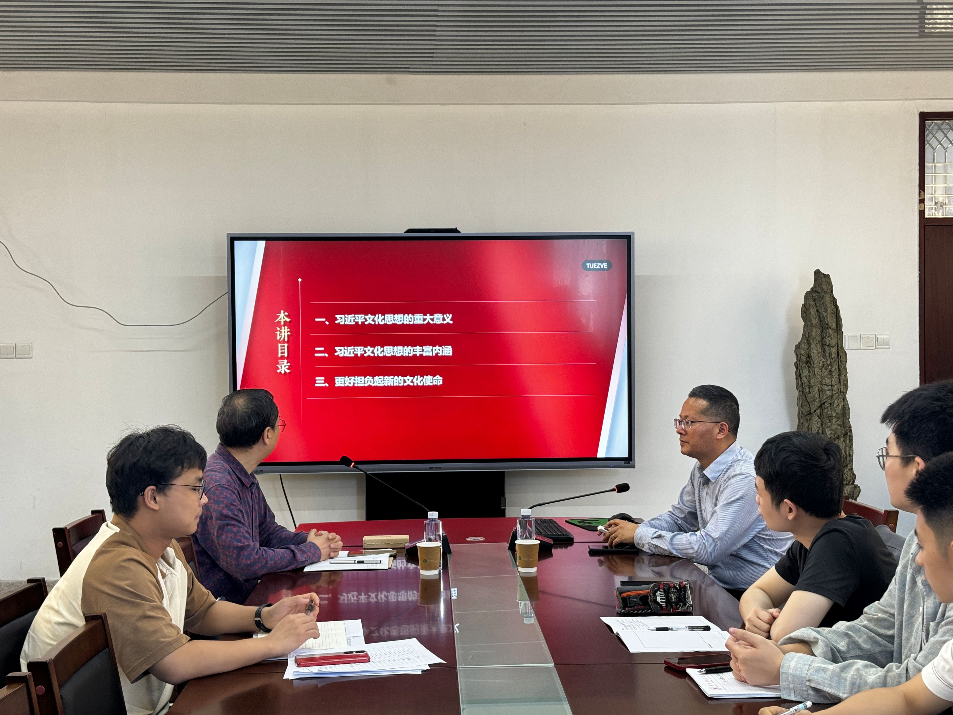俞国锋教授以习近平总书记考察各地文物古迹为切入点,结合习近平总书记对文化遗产保护传承的重视、推动物质文明和精神文明协调发展的重要论述、“两个结合”等内容详细阐述了习近平文化思想的丰富内涵和重大意义。俞国锋教授引经据典、史论结合列举了大量生动的实例,从“新文化使命”“坚定文化自信”“培育和践行社会主义核心价值观”等方面,对习近平文化思想的内涵进行了深入解读,他希望同学们更好担负起新时代建设社会主义文化强国的使命,奋发有为,共同建设中华民族现代文明。