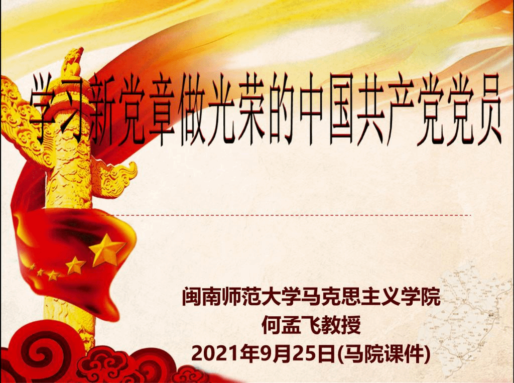 本次培训主要围绕着“把握十九大党章的内涵”和“加强党性修养,做一名光荣的共产党员”两方面进行阐述。首先,何孟飞教授介绍了当下我党内部的党员与党组织具体情况,详细解读了中国共产党章程的具体内容以及通过新旧党章部分内容的对比。使全体学员对于新党章有了更深入的了解,能够更好地把握十九大党章的内涵。接着,何孟飞教授从“党章的重要作用”、“加强党的长期执政能力建设、先进性和纯洁性建设”、“加强党性修养”、“努力学习习近平新时代中国特色社会主义思想”四方面展开阐述如何才能加强党性修养,从而成为一名光荣的共产党员。最后,何孟飞教授希望学员们能严格遵守党章的各项规定,以更高的标准要求自己,铭记党员自身的责任义务,积极为党尽职履责。