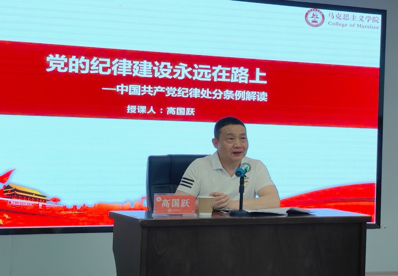 开班式后,高国跃教授以“党的纪律建设永远在路上”为主题,深入解读《中国共产党纪律处分条例》,他围绕着党的纪律的概念、党的纪律的形成、党的纪律的建设、条例修订的重要意义四个方面旁征博引,将正面引导和反面警示有机结合,通过丰富的案例支撑,深入浅出地讲述了党纪学习教育的重要意义,引导全体党员学纪、知纪、明纪、守纪。他指出,党的纪律无处不在,党员要习惯在党纪的约束下工作和生活,要以党的纪律来规范自身言行,把遵规守纪刻印在心,内化为言行准则,进一步加强自我约束,强化纪律意识。