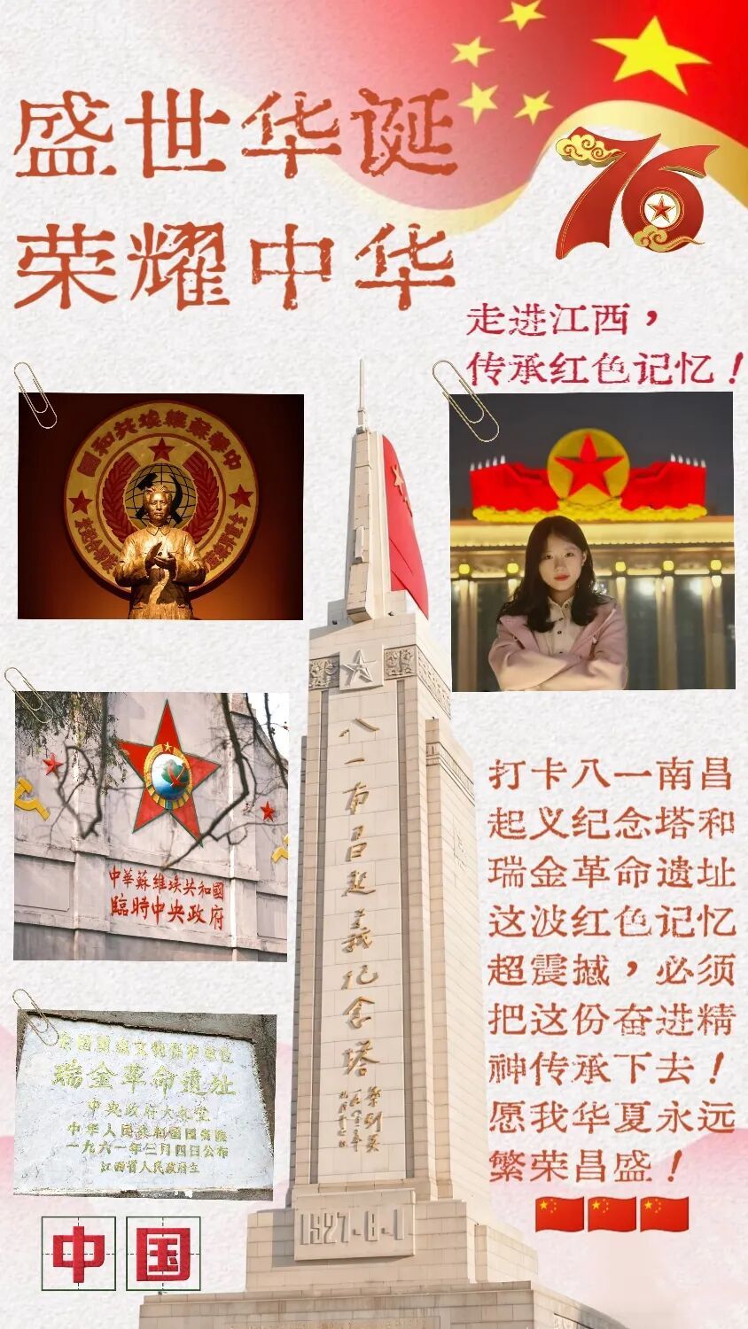 盛世华诞,荣耀中华。我踏上了一场跨越时空的红色之旅。当站在八一南昌起义纪念塔下,那雄伟的塔身仿佛是历史的丰碑,将1927年那划破夜空的枪声永远铭刻。我听到的,不仅是历史的回响,更是民族觉醒的呐喊。漫步瑞金,每一寸红土地都浸润着先辈的热血与信仰,简陋的旧址无声地诉说着“星星之火,可以燎原”的初心与执着。