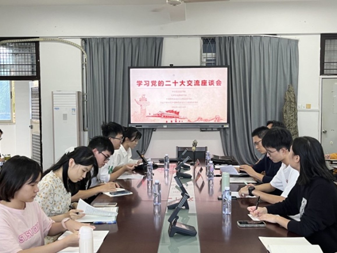 座谈会首先从社员们分享自己学习党的二十大报告的心得体会开始。简垒锋、徐珂、陈瑶等十一位社员作为代表分享了自己学习二十大报告的心得体会。同学们各抒己见、畅所欲言:有的同学从宏观角度出发对报告的内容进行梳理,畅谈学习二十大报告中的新理论,新论断的体会;有的同学选取了二十大报告中青年观、人民观等具体方面,分享了自己学习报告时的感想。