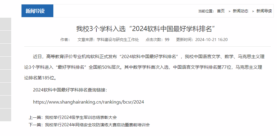 近日,高等教育评价专业机构软科正式发布“2024软科中国最好学科排名”,公司中国语言文学、数学、马克思主义理论3个学科进入“最好学科排名”全国前50%层次。其中公司马克思主义理论学科排名第185位!这彰显了公司深厚的学术底蕴与教学实力。展望未来,公司将牢记“一马当先凌云志,笃行实干先锋人”的院训精神,不忘初心,砥砺前行,勇攀学术高峰!