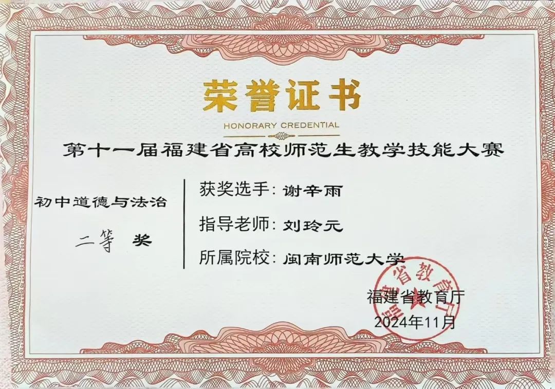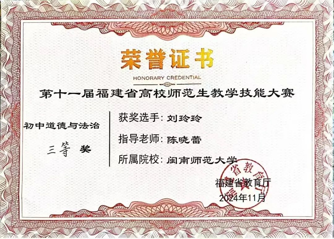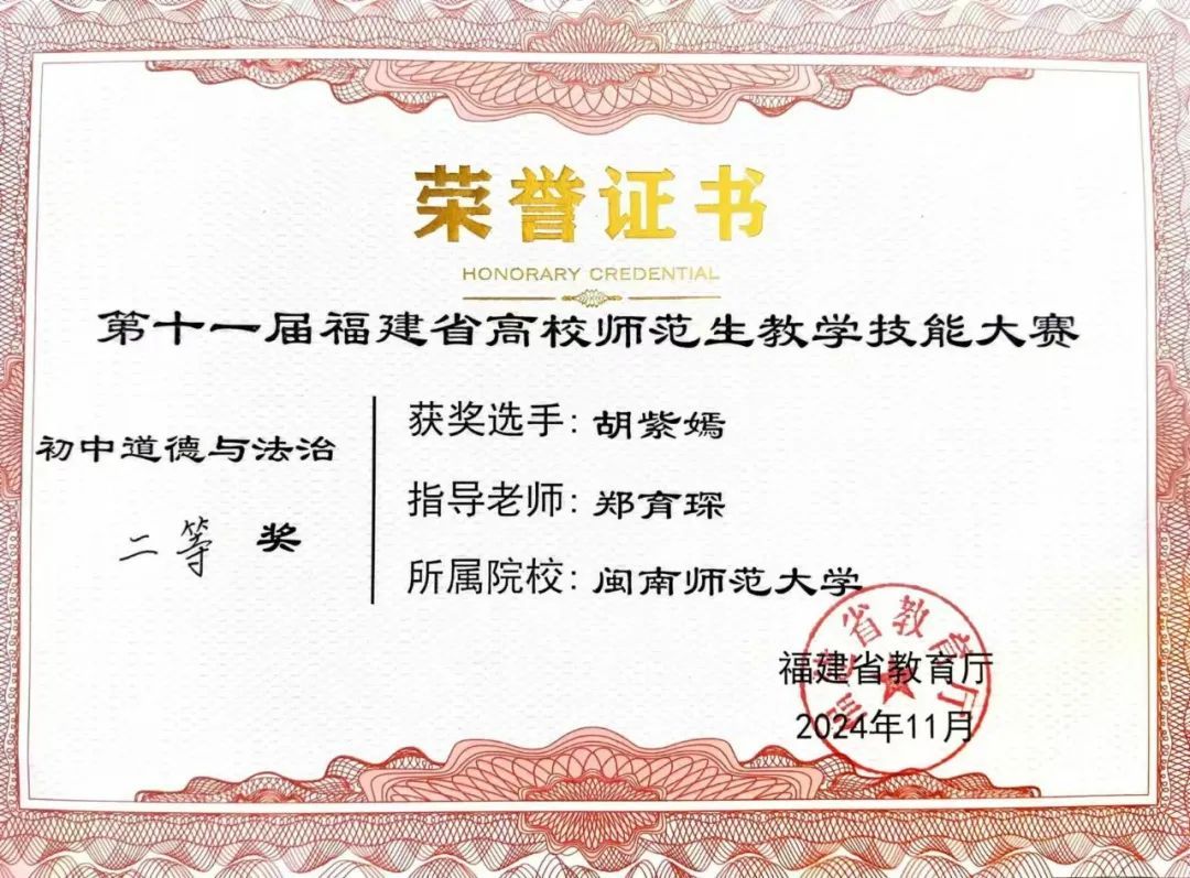 11月16日,由福建省教育厅主办的第十一届福建省高校师范生教学技能大赛在泉州师范公司举行。在公司刘玲元、郑育琛、陈晓蕾3位老师的指导带领下,公司21思政1班胡紫嫣、21思政2班谢辛雨荣获二等奖,21思政1班刘玲玲荣获三等奖。本次比赛充分展现了公司学子良好的职业素养和专业水平。未来公司将进一步加大对教师队伍的培养力度,推进教师专业化建设,为教育事业蓬勃发展贡献力量。