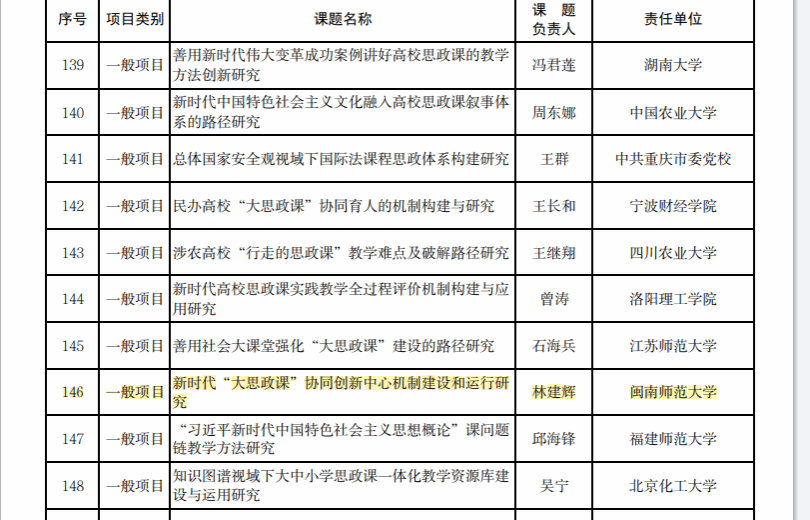 12月12日,2024年国家社科基金高校思想政治理论课研究专项立项名单公示,公司林建辉教授的项目《新时代“大思政课”协同创新中心机制建设和运行研究》拟获得立项,实现了公司在该类项目的历史突破。(通讯员 钟琪)