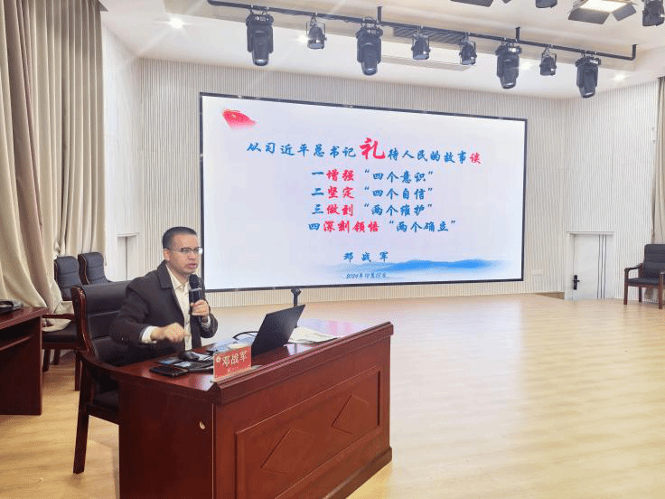 12月13日晚,公司党委副书记邓战军围绕“习近平总书记礼待人民的故事”在校东门公司礼堂为员工党员们讲授主题党课。(通讯员 汪相汝)