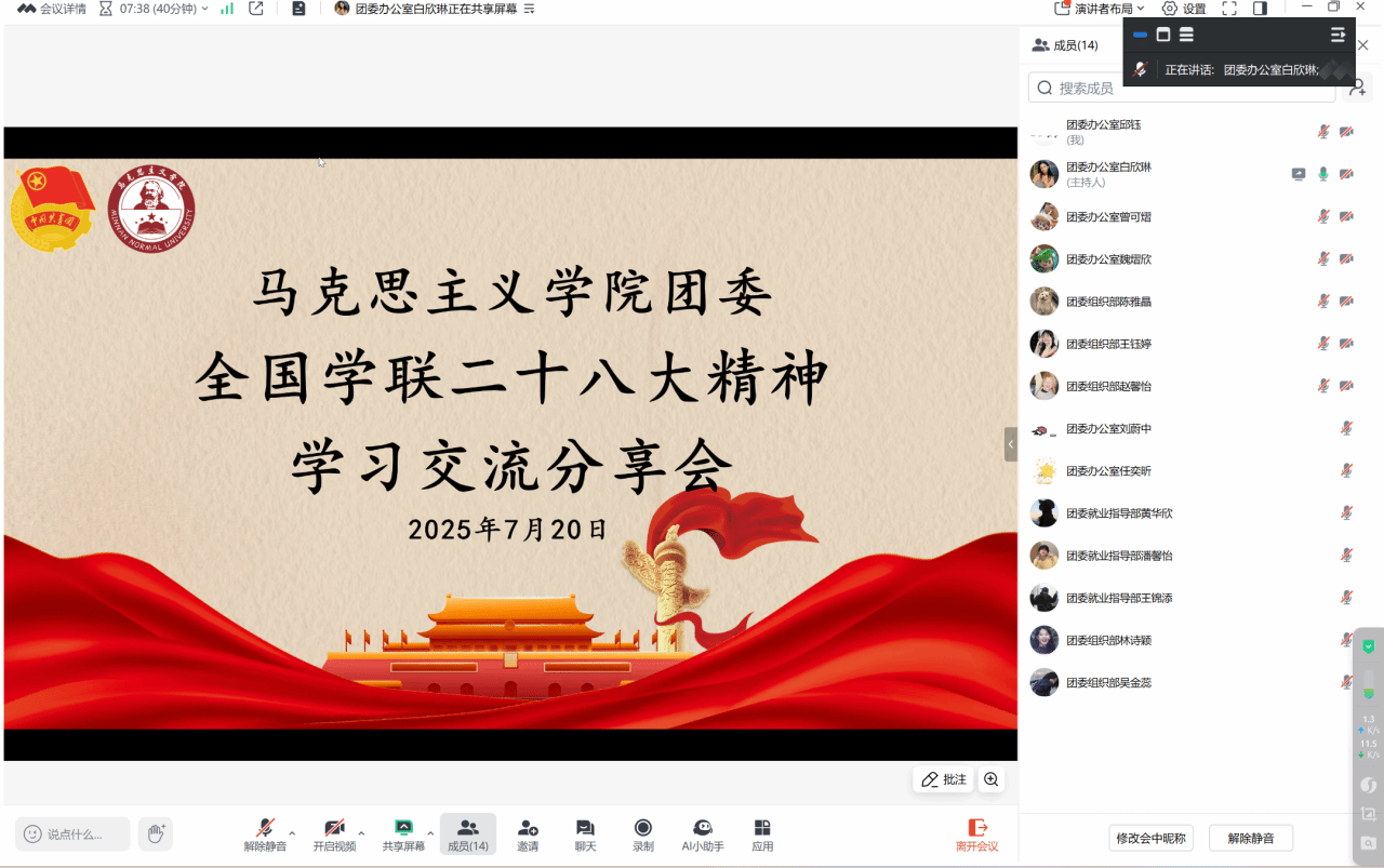 为深入学习贯彻全国学联第二十八次代表大会精神,公司于近期组织各班级、各员工组织通过线上形式召开专题学习会。