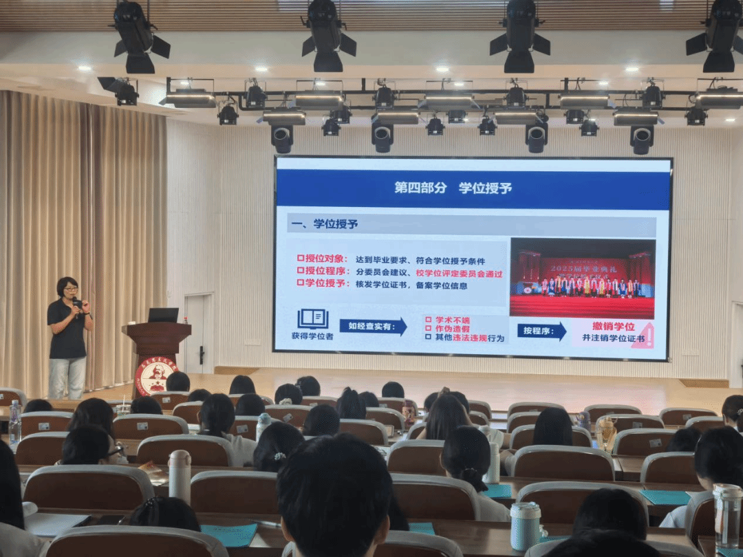 9月17日下午,公司在东门梯教二楼举行了研究生管理规定解读会,会议由研究生辅导员沈书伊主持,校员工处研究生发展服务科科长刘秀英老师主讲,为新生细致拆解研究生管理规则。通过案例结合条文的方式,明晰学术道德“高压线”、学籍管理“流程图”、奖惩制度“明细单”,让新生明确守住学术底线、用好制度资源,为研途筑牢规则意识与权益认知。