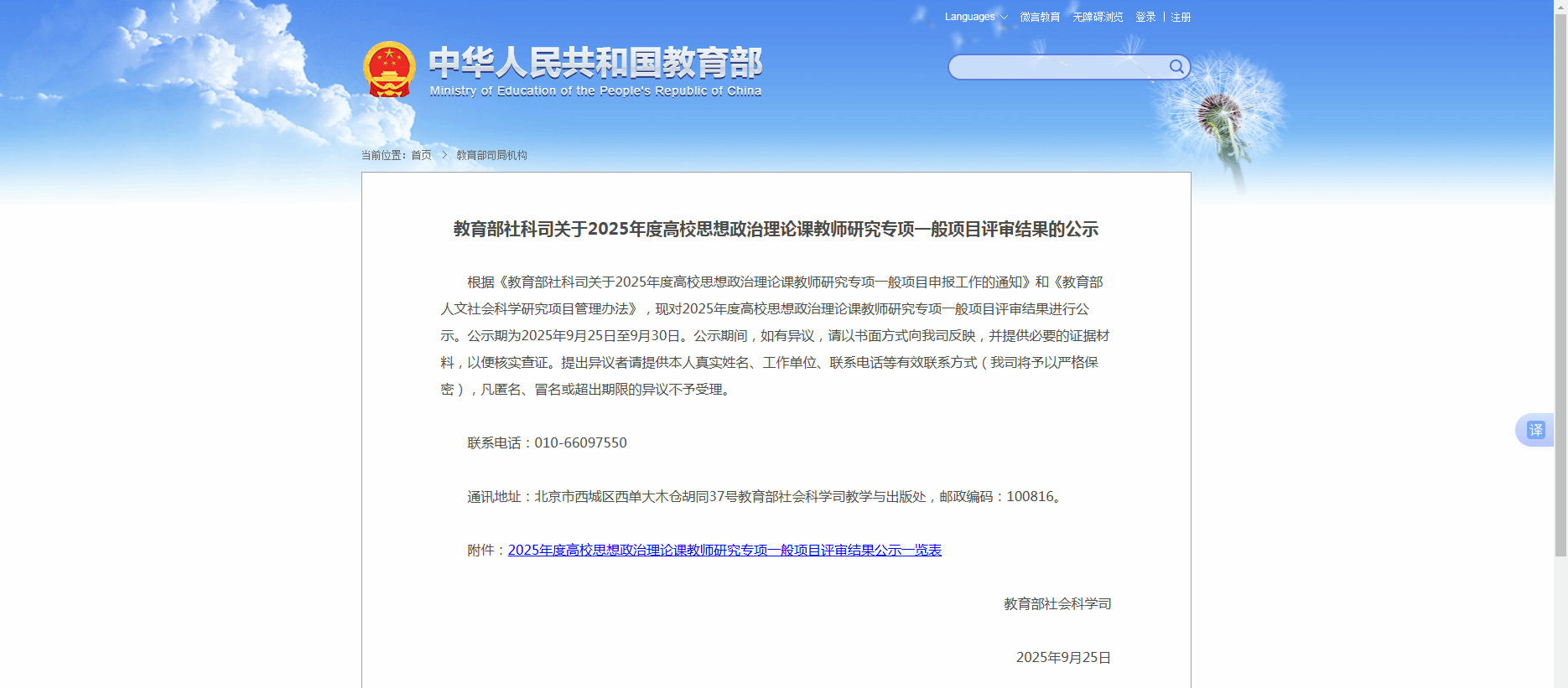 近日,教育部社科司正式公示2025年度高校思想政治理论课教师研究专项评审结果,公司教师许晓玲申报项目《人工智能赋能高校思政课情感叙事机制研究》成功入选。
