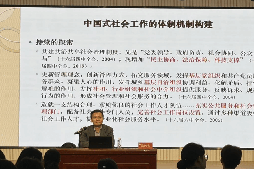 11月6日,中共上海市委党校社会学教研部马西恒教授莅临公司东门梯教二楼报告厅作“国家治理现代化视域下的中国式社会工作融合发展”专题讲座,公司师生100多人聆听讲座。 马西恒教授先从社会工作的“碎片化”问题切入,从定义和具体实践两个方面去分析“社会工作”碎片化,并引出其中存在的缺陷。接着马教授从国家治理现代化视域去解读社会工作,指出国家治理现代化的根本方向是完善和发展中国特色社会主义制度,根本途径是推进整体性、系统性、协同性的全面深化改革。随后马教授深入剖析了 “中国式社会工作”的定义方式,并指出在中国语境下,“社会”被视为一个需要“建设”和“治理”的场域,这一体制化理解有其特定的政治逻辑和历史脉络。因此,他认为中国式社会工作面对的是总体性的社会问题,必须在国家治理的总体性框架中寻找自身定位。马教授重点分析了中国式社会工作的多重功能,回顾了我国在建立健全中国式社会工作的体制机制中的历史演进,并向同学们描绘了一幅社会治理“共建共治共享”的治理蓝图。最后,马教授建议同学们在以后的学习工作中要学会建构自主知识体系,并主动融汇党的群众路线与中国优秀传统文化,形成扎根中国社会工作的基础理论和方法体系。