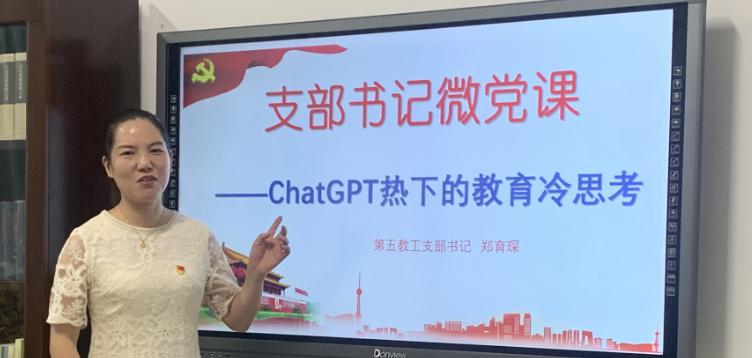 会上,支部书记郑育琛围绕着“ChatGPT教育热的冷思考”这一话题,首先从二十大报告强调教育的战略地位出发,提出教育、科技、人才是全面建设社会主义现代化国家的基础,并提出在二十大报告中,特别强调推进教育数字化,建设全民终身学习的学习型社会、学习型大国。其次,郑育琛从“横空出世的chatGPT”这一互联网新事物对教育以及教师职业带来的冲击进行分析,指出随着互联网和人工智能的发展,教育面临着新的挑战,虽然教师的职业还是未来社会不被机器人替代的职业,但是作为教师要学会不断更新自己的知识素养,主动拥抱互联网的新技术,才能在“未来已来”的社会中,站稳三尺讲台。郑育琛最后提出未来的教师要秉持立德树人的教育理念,做终身学习者、情绪价值提供者和学习示范者。