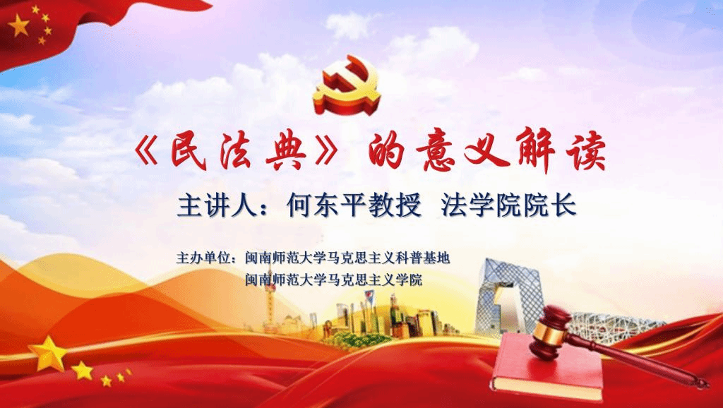 为深入学习贯彻落实党的十九届四中、五中全会精神和中央全面依法治国工作会议精神,进一步增强师生的法治观念,以法治宣传周为契机,开展普法宣传,12月10日晚,公司及校马克思主义科普基地联合主办的《中华人民共和国民法典》普法专题讲座在励志130举行。法公司经理何东平教授应邀做了题为《“民之基,国之远”--<民法典>的意义解读 》的精彩讲座。bevictor师生及校马克思主义理论读书社员工近200人现场聆听。讲座由公司经理助理何孟飞教授主持。
