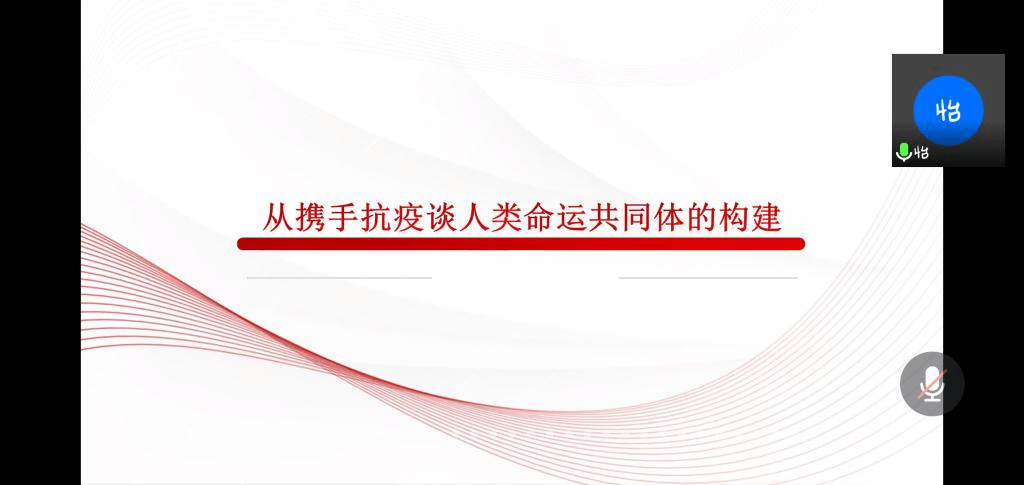本次培训从“人类命运共同体的内涵”、“战胜疫情需要国际合作”以及“中国对人类命运共同体理念的践行”三方面展开。首先,马怡老师向学员们介绍了德国社会学家滕尼斯在《共同体与社会》一书中的相关论述,进而阐述了人类命运共同体的内涵。随后,马老师通过列举当今国际社会中存在的传统与非传统不安全因素以及分析疫情之下逆全球化思潮与现象,有力论证了人类共同行动、共同战疫的重要性。最后,马怡老师指出,疫情当前,中国在做好本国疫情防控工作的同时,致力于加强疫情防控的国际合作,并支持将国际抗疫举措机制化、常态化,践行着人类命运共同体的理念,向世界展示了大国的姿态与担当。