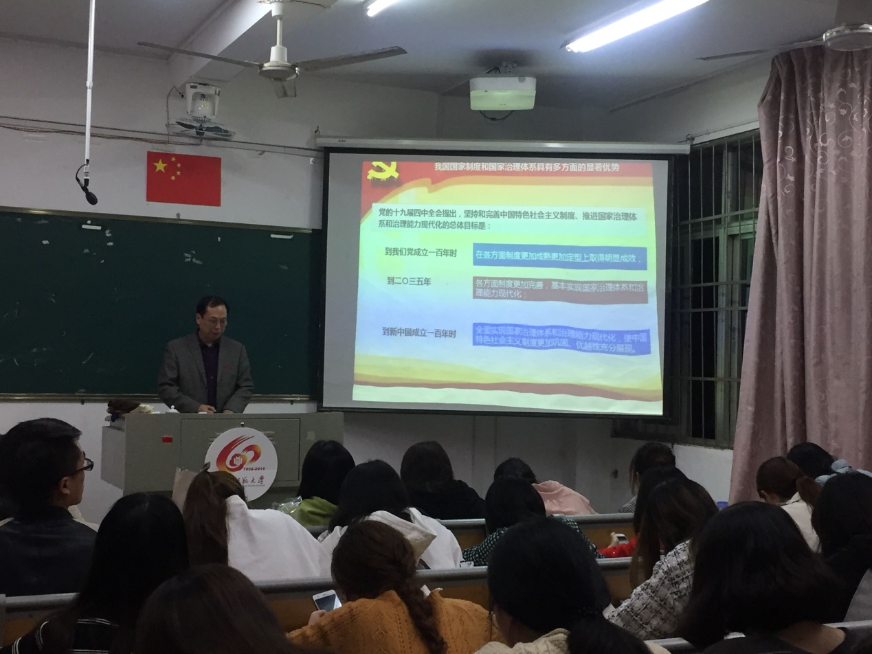 何孟飞老师从党的十九届四中全会主题出发,系统阐述了我国国家制度和国家治理体系的显著优势、正确认识目前国家治理面临的困难、准确把握国家治理内涵及治理要求、提高国家治理水平和治理能力的路径等四个方面内容。何老师指出,党的十九届四中全会是我们党站在“两个一百年”奋斗目标历史交汇点上召开的一次具有开创性、里程碑意义的会议,学习好、宣传好、贯彻好党的十九届四中全会精神,是当前和今后一个时期全党的重要政治任务。