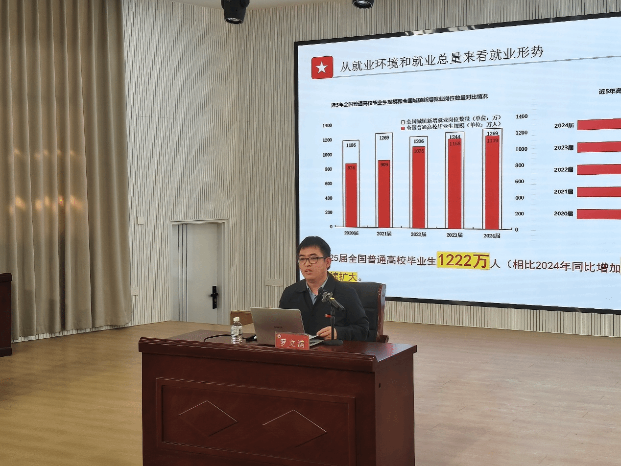 罗立满老师就当前就业形势为同学们进行分析和指导,他通过大量图表和数据,他从全国大学毕业生1222万、前几年待业老员工未来几年不断创新高的毕业生、教师需求减少、人工智能因素等方面全面深入地分析当前高校毕业生面临严峻的就业形势。勉励大家更加理性、清醒地看待当前面临的就业压力,用“抢”“拼”的状态积极主动参与就业市场竞争,拓宽职业选择领域,保持闯的劲头、矢志拼搏奋斗,争取早日就业。