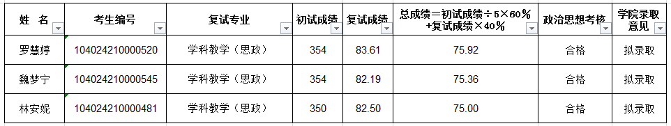 公司学科教学(思政)专业新增4个联培计划指标,按照公司关于再次调配的相关学科(专业)复试录取办法规定,现从一志愿复试备选名单中从高到低依次递补3名考生,且已征求考生同意参加“联培计划”。