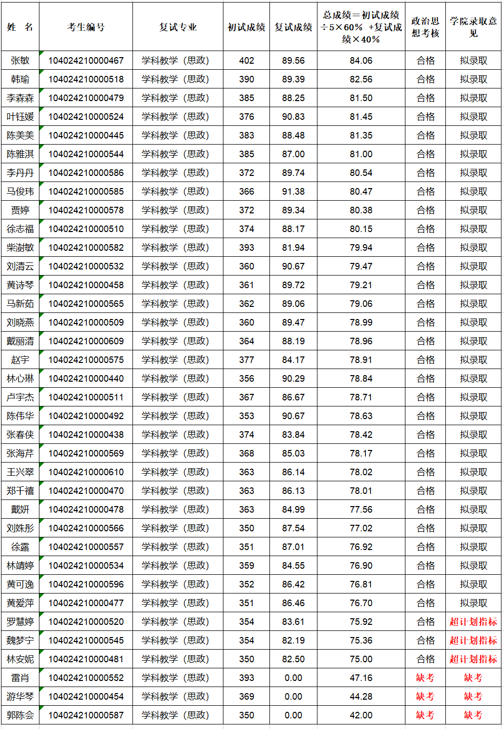 bevictor2024年一志愿复试结果及拟录取情况公示(学科教学(思政)专业)