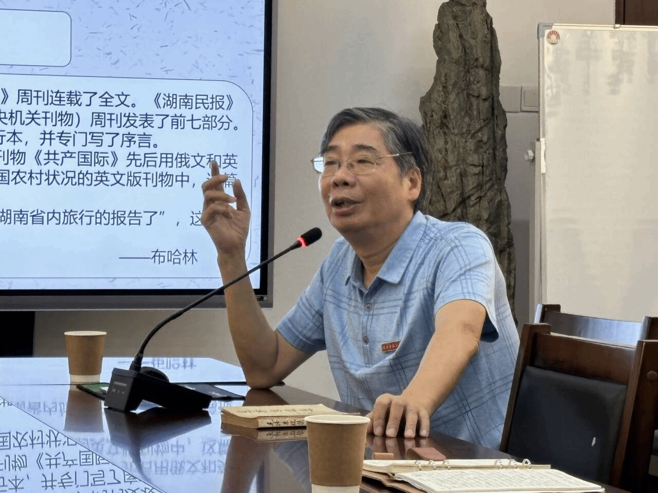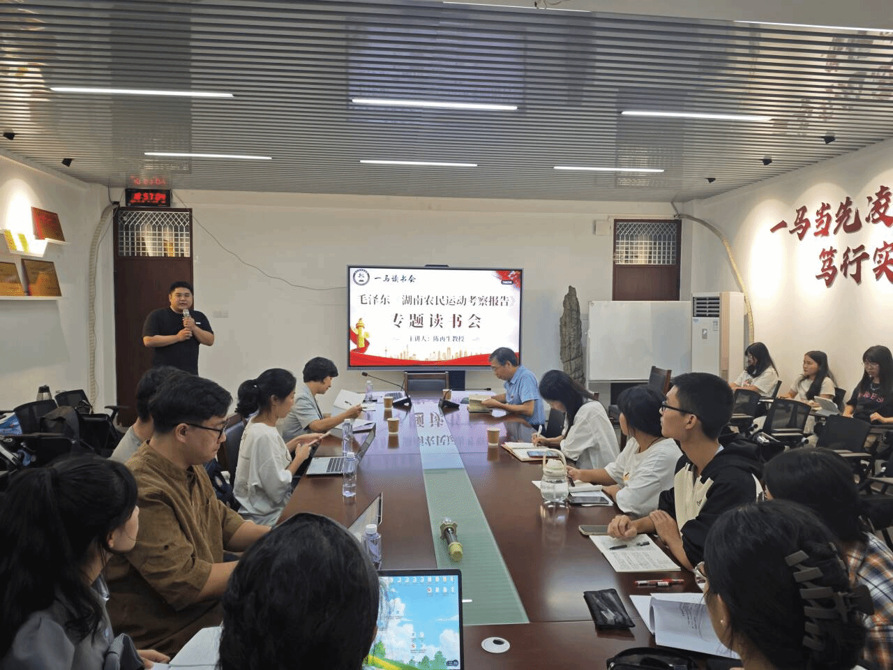 在读书会中,陈再生教授从写作背景、主要内容、历史地位三个部分出发,围绕《湖南农民运动考察报告》展开导读。首先,引用青年时期毛泽东的求学经历和实践案例,生动鲜明地展现出毛泽东对调查研究工作的重视。他指出,《湖南农民运动考察报告》是毛泽东为了答复当时党内党外对于农民革命斗争的责难而写,也是为了反对当时党内存在的两种机会主义而写。其次,陈再生教授围绕《湖南农民运动考察报告》的主要内容,梳理了七个章节之间的逻辑脉络,并邀请同学对经典文本部分进行诵读。他特别强调普及政治宣传的重要性,指出农民运动的开展离不开党的思想政治教育,党的思想政治教育在中国的革命、建设和改革事业发挥着巨大作用。最后,陈再生教授阐述了《湖南农民运动考察报告》的历史地位。就文本而言,这篇考察报告成为毛泽东第一篇被介绍到国外的文章。就中国革命而言,这篇考察报告进一步深化了对农民和农民运动的认识,为解决中国民主革命的中心问题作出重大贡献。就毛泽东本人而言,这不仅坚定了他深入农村领导农民革命的决心,还初步奠定了其在共产国际的地位。