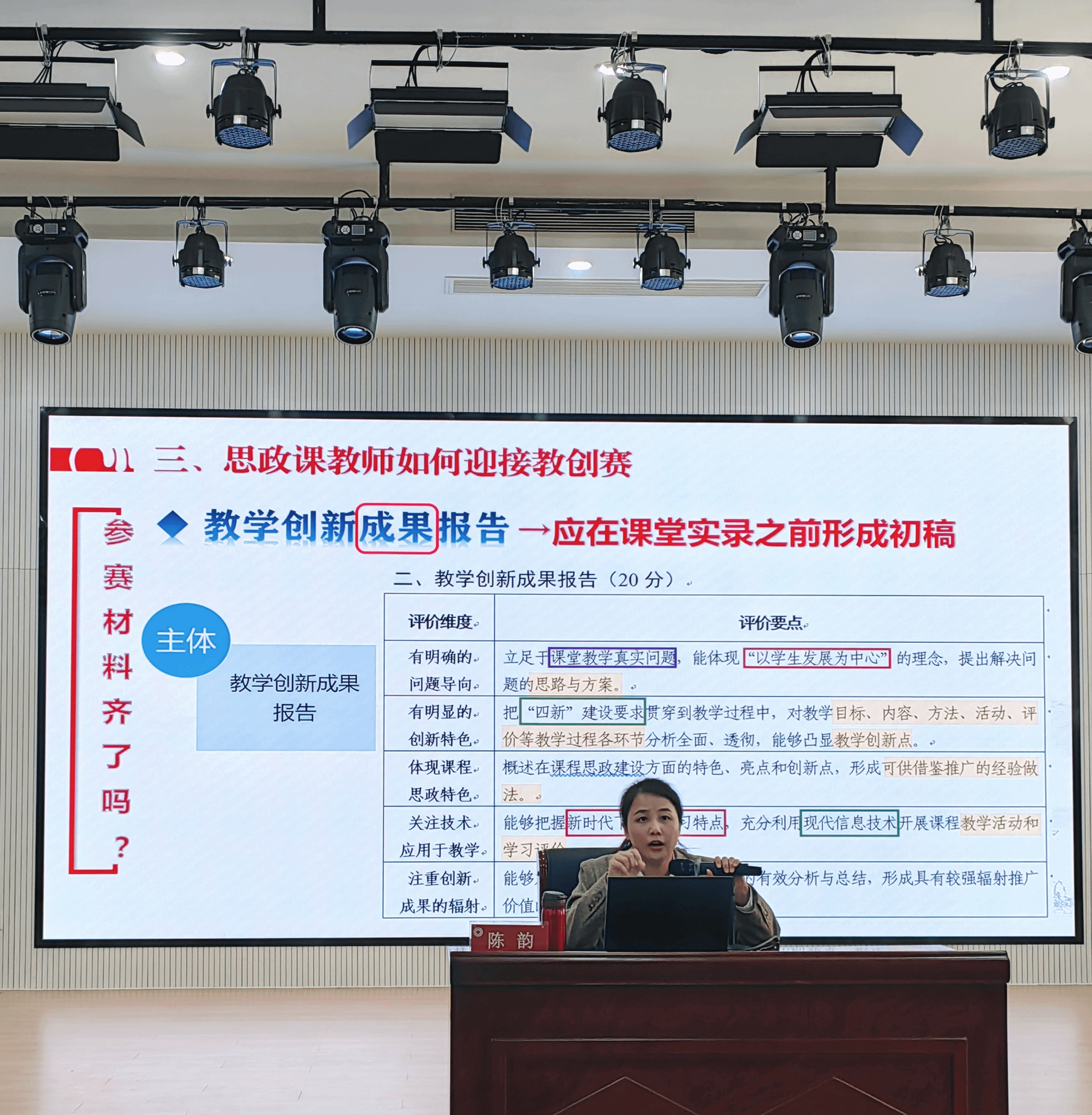 讲座中,陈韵教授对高校教学创新背景下的教学创新大赛作了全面介绍,详细阐述了高校思政课教学与“两性一度”的紧密联系,强调了高阶性、创新性和挑战度在教创赛中的关键体现。陈韵教授结合参加第四届全国高校教师教创赛的经历,从材料准备、撰写、课程拍摄等多个方面,分享了宝贵经验和实用技巧,为在场的思政课教师提供了详细指导。