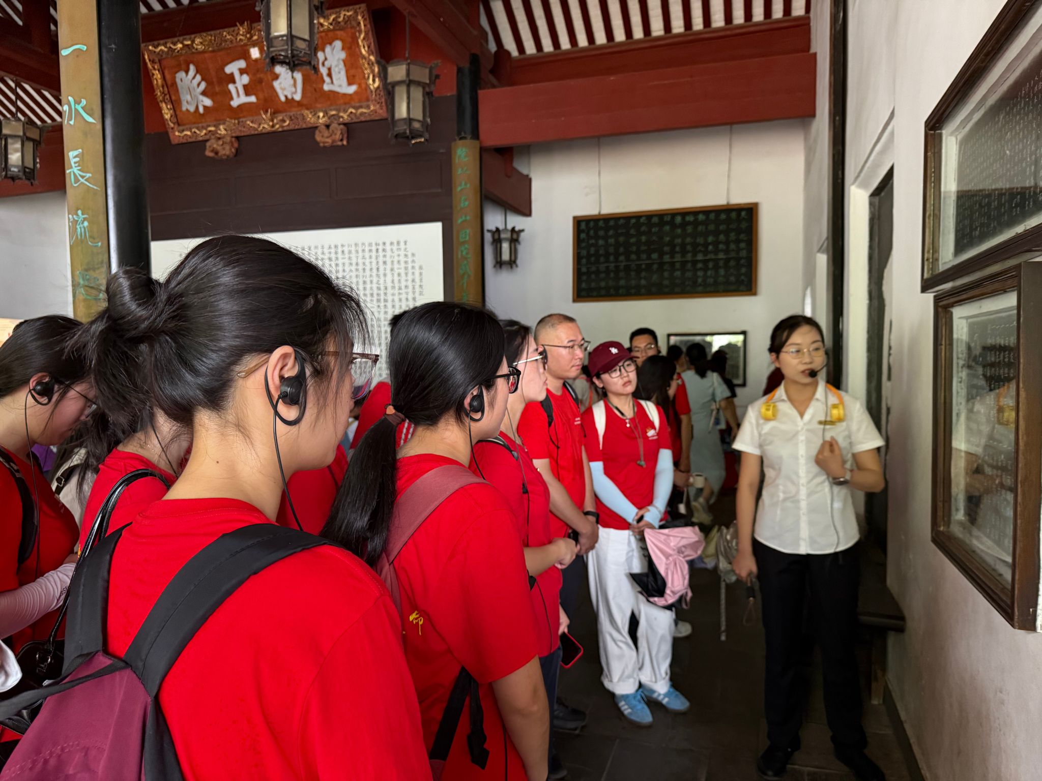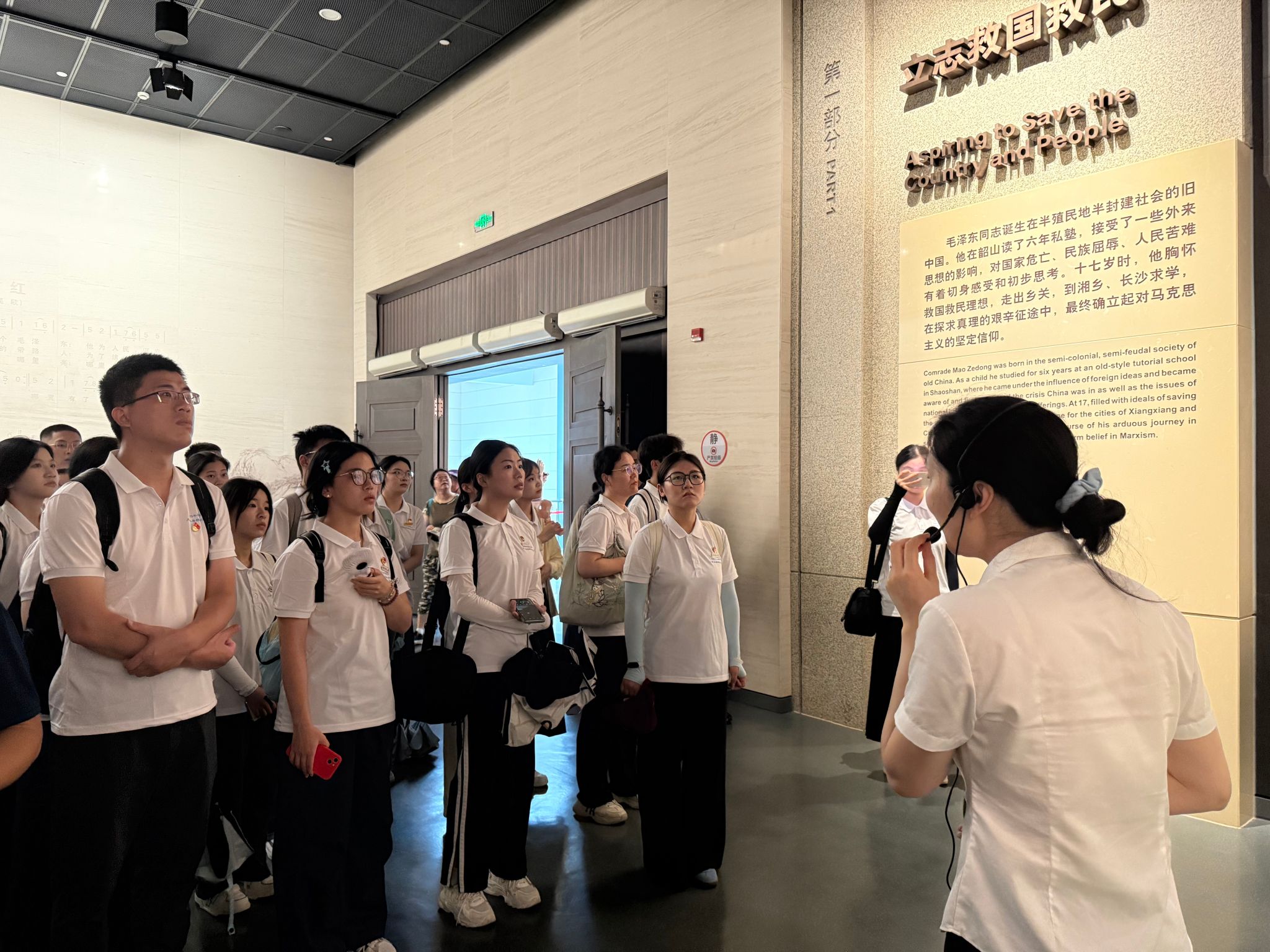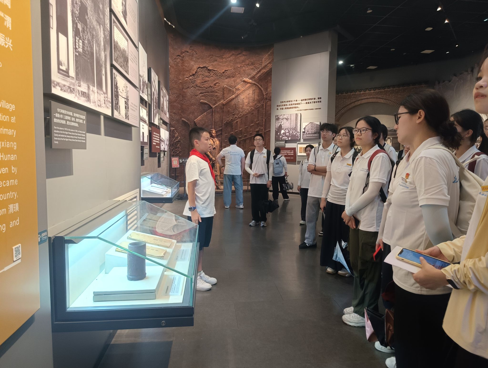 实践队探访岳麓书院和湖南第一师范公司,深刻领悟习近平总书记关于“教育是国之大计、党之大计”的重大意义,在底蕴深厚的中华文明中探寻推动教育科技人才良性循环的历史印记,了解到湖湘大地的先人们究天人之际、格物穷理的崇尚科学、经世致用的优良传统,写就了“一部近代史,半部湖南人”的壮美传说。李颖诺同学在研学中表示,“岳麓公司、城南书院、湖南第一师范公司以重视员工全面发展、育天下英才为己任,培养了一大批救国救民的仁人志士,影响推动了中国近现代历史进程。”在湖南一师旧址,实践队追寻青年毛泽东“身无分文,心忧天下”的求学足迹,感悟到早期的湖南一师就以“修养教育家之精神”为目标,为党和国家培养诸多栋梁。正是在一师受教育的革命先烈推动中华民族站了起来,以青春之躯肩负起中华民族伟大复兴的重要使命。“双带头人”教师党支部书记姚禹博士在参观后表示,“在这里我学习了湖南一师‘教育救国’的历史,看到中华民族历来注重‘育才造士’,信奉‘国有贤良之士众,则国家之治厚’的传统文化。以史为鉴,我们要为加快建设世界重要人才中心和创新高地,实现教育强国建设目标而不懈奋斗”。