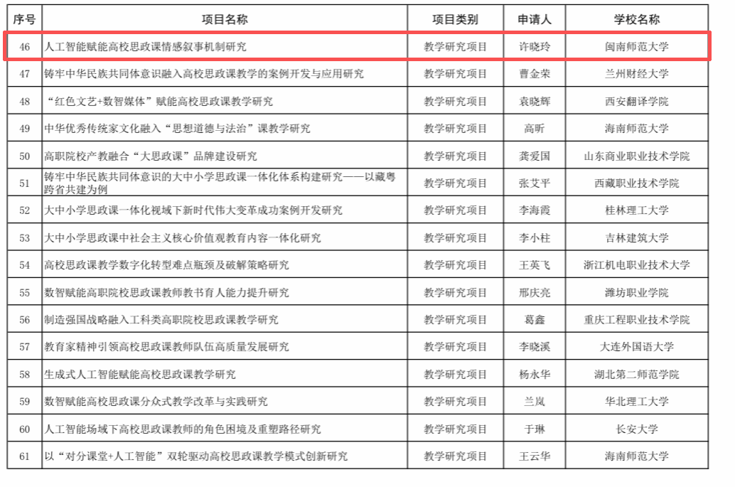 近日,教育部社科司正式公示2025年度高校思想政治理论课教师研究专项评审结果,公司教师许晓玲申报项目《人工智能赋能高校思政课情感叙事机制研究》成功入选。(通讯员 杨纯真)