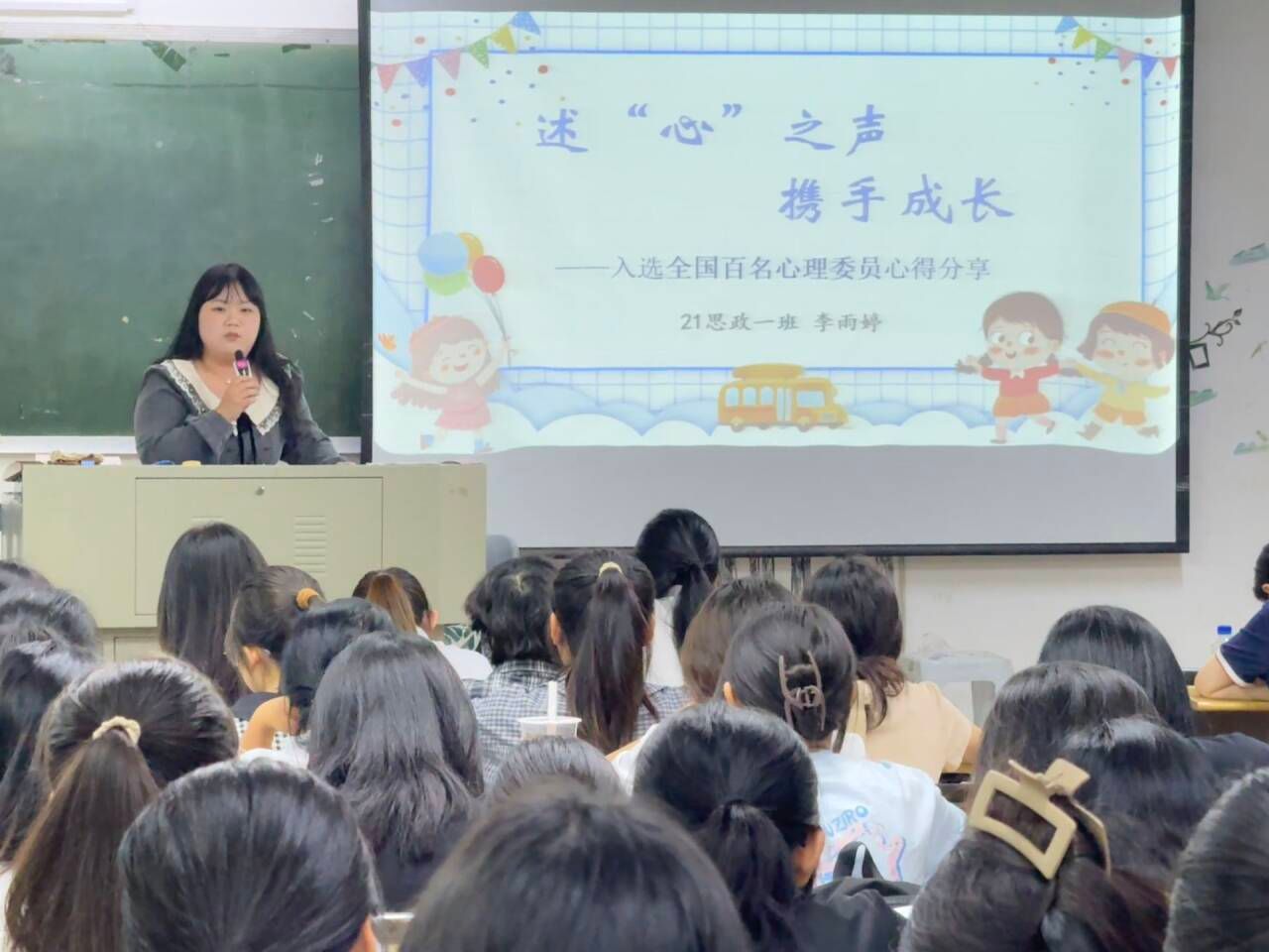 11月3日晚,公司入选“全国百名心理委员风采展”的21级思政一班心理委员李雨婷为全体心理委员、宿舍心理信息员进行了以“述‘心’之声 携手成长”为主题的心得分享。(通讯员 施心瑜)